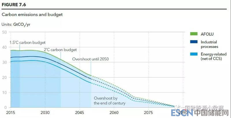 該報(bào)告重申,在66%的“可能”概率閾值下,控制溫升不超過(guò) 2°C的二氧化碳總預(yù)算為37,000億噸二氧化碳當(dāng)量。在扣除8000億噸非二氧化碳排放(如甲烷排放以后),能源相關(guān)的碳排放預(yù)算為29,000億噸。按照這一預(yù)算,2021年的碳排放將導(dǎo)致溫升1.5°C,2037年的碳排放將導(dǎo)致2.0°C;而2050年全球二氧化碳排放量將超出預(yù)算3900億噸,本世紀(jì)下半葉溫升將工業(yè)化前全球平均水平的2.6°C。
