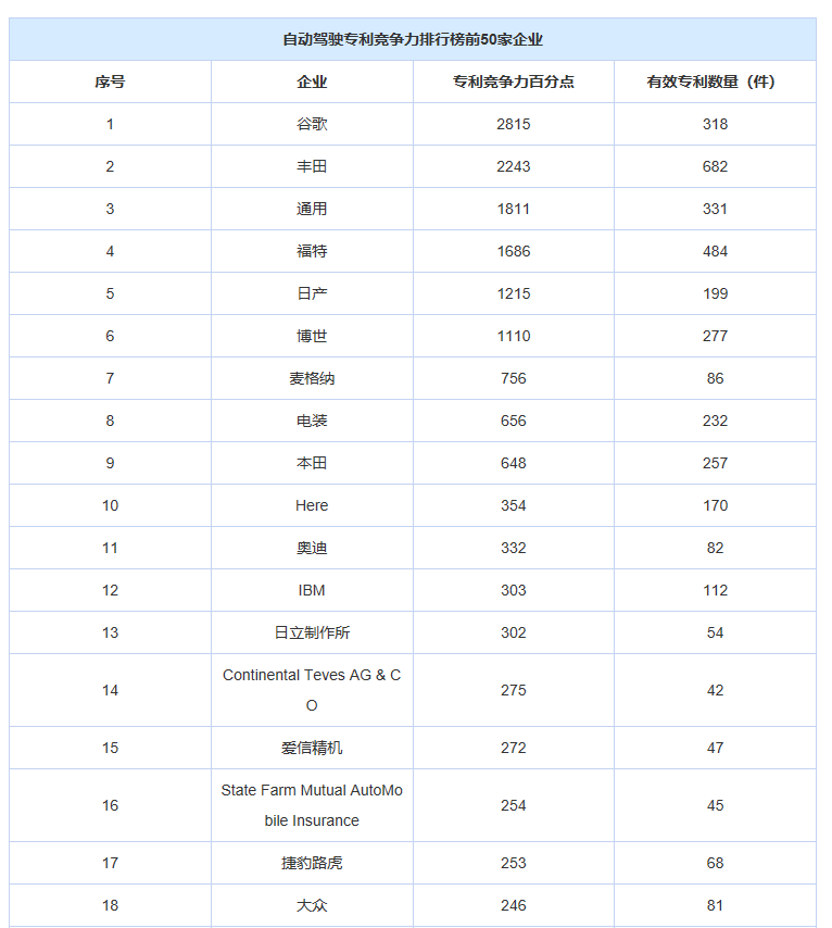 近日,日本權(quán)威媒體與專利分析公司Patent Result合作,出了一份自動(dòng)駕駛專利競爭力排名,排在第一的是谷歌Waymo、第二是豐田,前十名主要被美國和日本車企所占據(jù)。前50名中沒有中國企業(yè),滴滴出行排在第90位,百度排在第114位。原因在于,雖然申請(qǐng)專利的中國企業(yè)數(shù)量很多,但“尖端專利報(bào)告的引用次數(shù)”比較少。