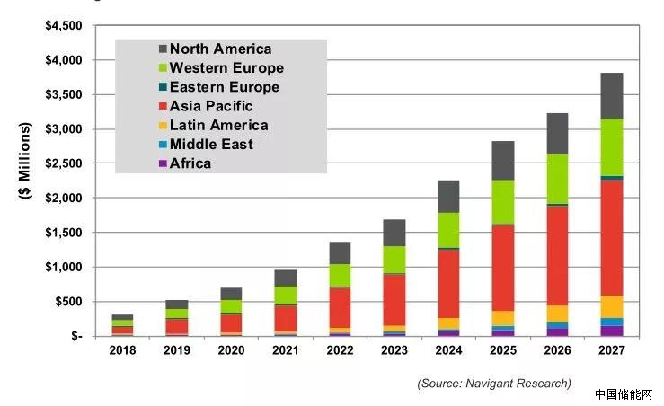 Navigant Research報告對電網(wǎng)側(cè)、工商業(yè)、用戶側(cè)以及遠(yuǎn)程/斷電等四個細(xì)分市場和七個世界區(qū)域中固定儲能使用PCS的市場進(jìn)行了預(yù)測,預(yù)計在未來10年世界所有地區(qū)儲能變流器PCS的應(yīng)用都將出現(xiàn)顯著增長,其中亞太地區(qū)會成為最大的儲能變流器PCS消費區(qū)域。亞太地區(qū)2019年儲能變流器PCS安裝量將呈現(xiàn)翻倍式增長,2024年安裝量將突破十億,2027年將占全球的全球市場份額的43.2%。繼亞太之后,西歐和北美也占據(jù)了較大的市場。雖然北美國新儲能總安裝容量更高,但西歐擁有更大的市場份額。西歐儲能裝機(jī)量很大一部分來自價格更高的分布式系統(tǒng)。