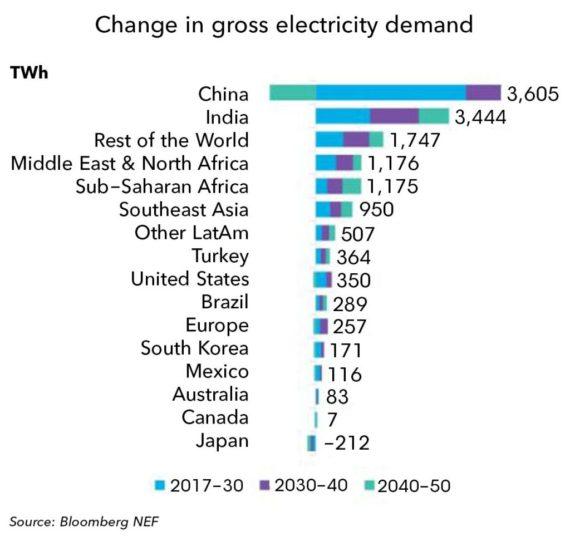 非洲,中東和東南亞的新興國家都將因人口,GDP和電力供應(yīng)增加導(dǎo)致電力需求翻番。另一方面,BNEF預(yù)計經(jīng)合組織國家的“需求增長”將“出現(xiàn)疲軟,甚至開始收縮”,這反映出能源效率提高,經(jīng)濟適度增長率以及能源密集型產(chǎn)業(yè)不斷退縮。