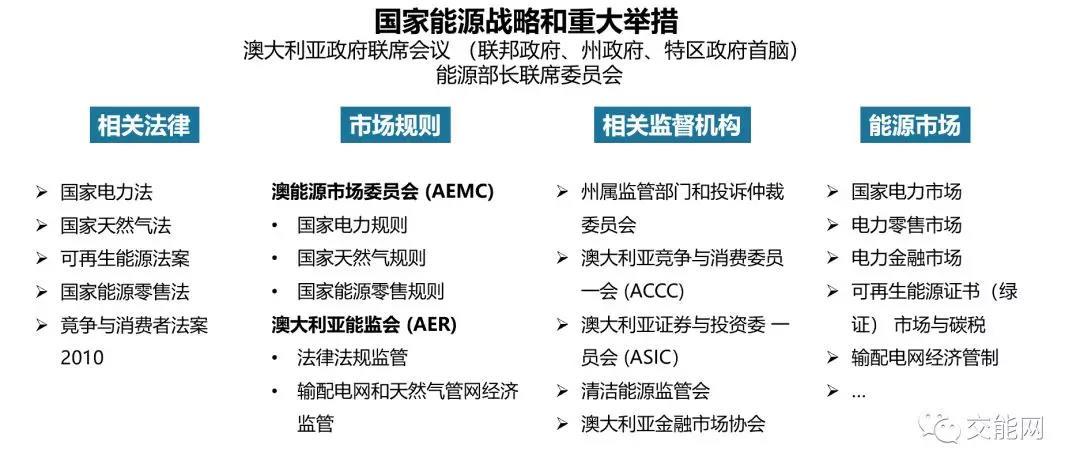 從上面的介紹就可以看出,澳大利亞的電力市場是一個強監(jiān)管市場。下圖具體展示了澳大利亞負責國家重點能源戰(zhàn)略和重大舉措的相關(guān)法律、規(guī)則、監(jiān)督機構(gòu)以及相關(guān)市場。