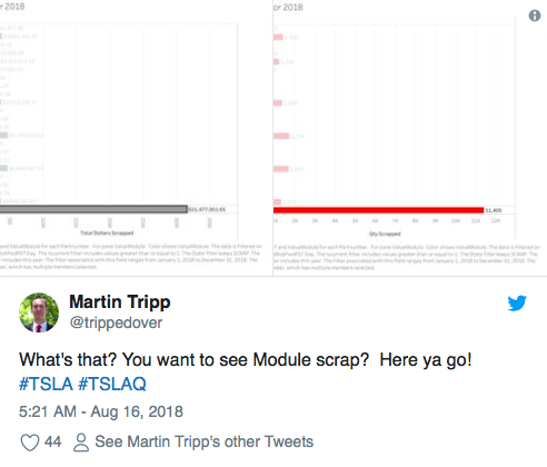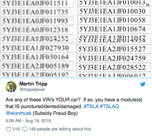 Tripp表示特斯拉的超級工廠在制造工藝上走了危險(xiǎn)捷徑,而馬斯克對此是直接知情的,但并未進(jìn)行干預(yù)。他在推文中寫道,列出的車輛識別號碼指的是采用了受損電池的具體車輛,這些受損電池根本不應(yīng)當(dāng)被安裝在車輛中。這是一系列推文中的第一條: