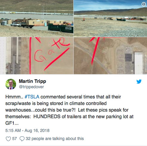 Tripp還在推特上發(fā)布了一些照片,聲稱特斯拉將廢物廢料存放在超級工廠的露天停車場和卡車上,而不是在溫控倉庫里。他還分享了一些截圖,表示工廠內(nèi)有大量廢料。