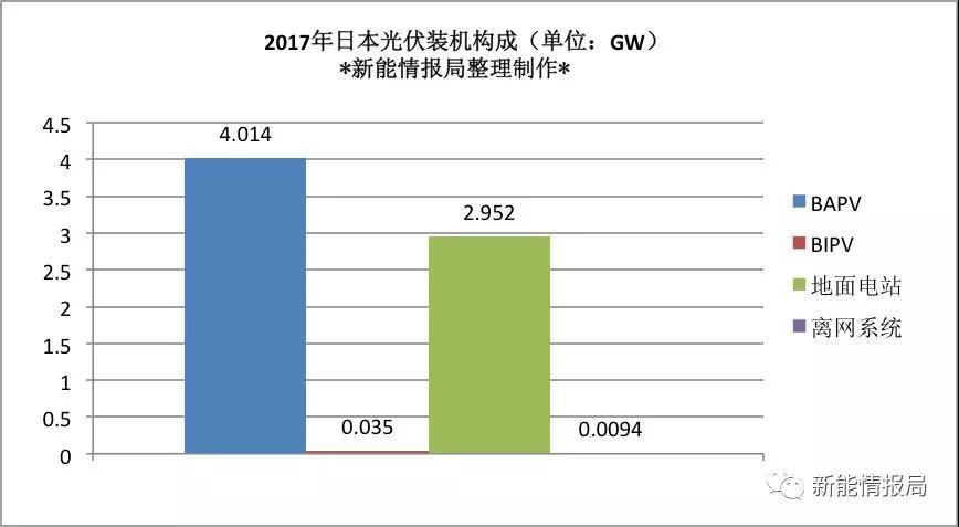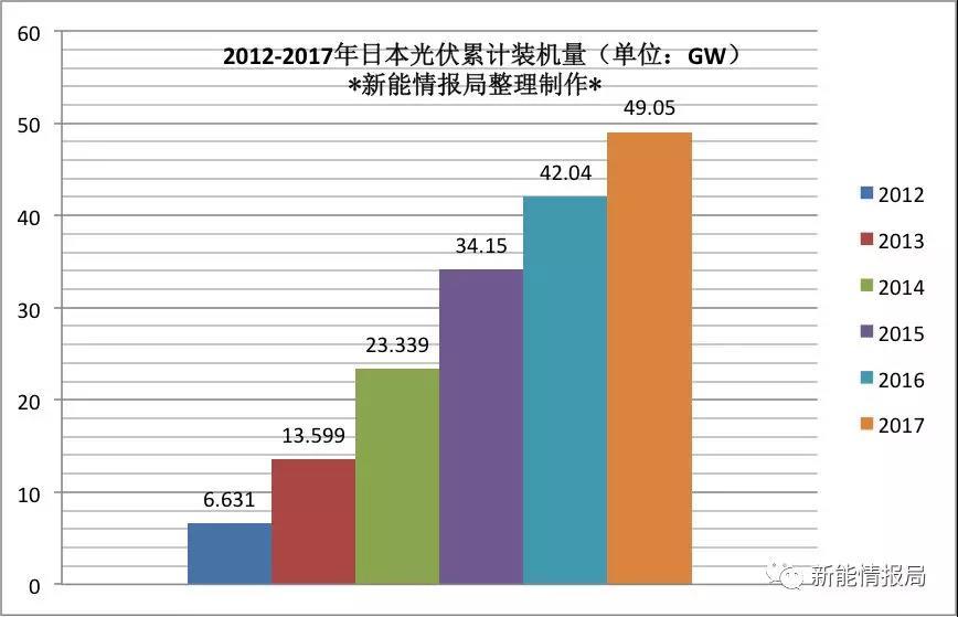 截止2017年底,日本光伏累計(jì)裝機(jī)量為49.051GW,其中并網(wǎng)項(xiàng)目48.88GW,離網(wǎng)項(xiàng)目為0.171GW。而2012年日本光伏累計(jì)裝機(jī)量?jī)H為6.631GW。