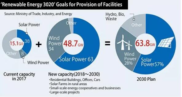 中國儲能網(wǎng)訊:“可再生能源3020實施計劃”是韓國政府為實現(xiàn)能源轉(zhuǎn)型于在2017年末提出的。其目標(biāo)是到2030年,可再生能源占總能源消耗比例達(dá)到20%。為實現(xiàn)這一目標(biāo),在此期間需要增加4870萬的可再生能源裝機容量,最終達(dá)到6380萬的裝機規(guī)模,其中風(fēng)電占比28%和太陽能占比57%。