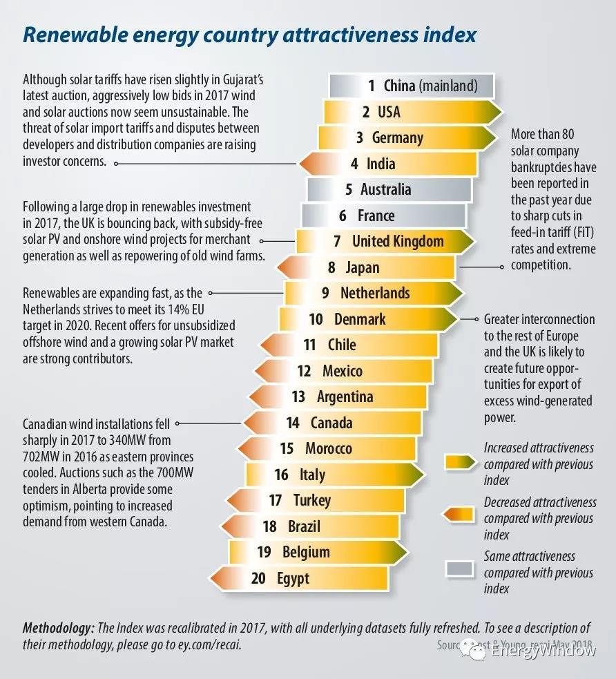 英國光伏就從此一蹶不振了么?似乎恰恰相反,英國光伏行業(yè)即將迎來發(fā)展的新機遇。根據(jù)安永發(fā)布的可再生能源國家吸引力指數(shù)報告,英國排名第7,高于2017年和2016年的第10和13位。