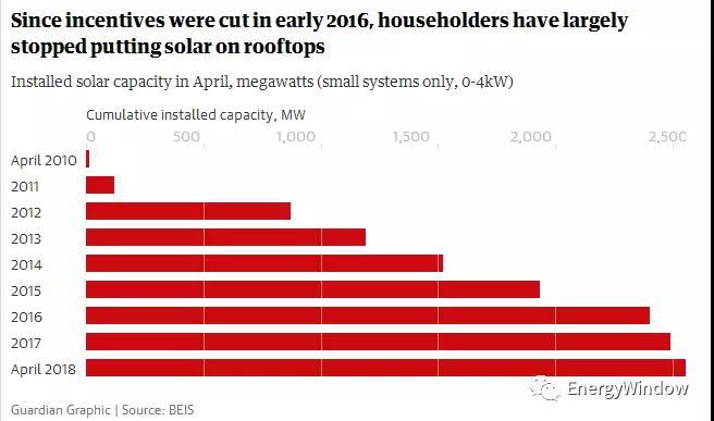 一時之間,曾經(jīng)是歐洲光伏裝機增長最快的英國,遭遇光伏大滑坡。2016年前兩月英國光伏裝機21MW,去年同期則是81MW。2018年,英國預(yù)計光伏裝機14MW,2011年的新增裝機則是606MW。