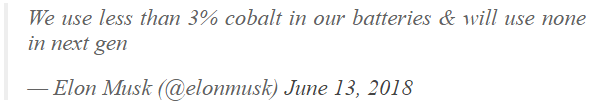 中國儲能網(wǎng)訊:近日,馬斯克在發(fā)布的推特中稱特斯拉的鈷使用量將從目前的3%降至0%。