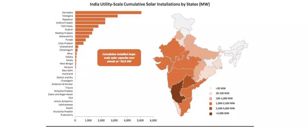 卡納塔克邦累計(jì)總裝機(jī)量率先超過(guò)5GW,Telangana,Rajasthan和Andhra Pradesh分別位列第二,第三和第四名。