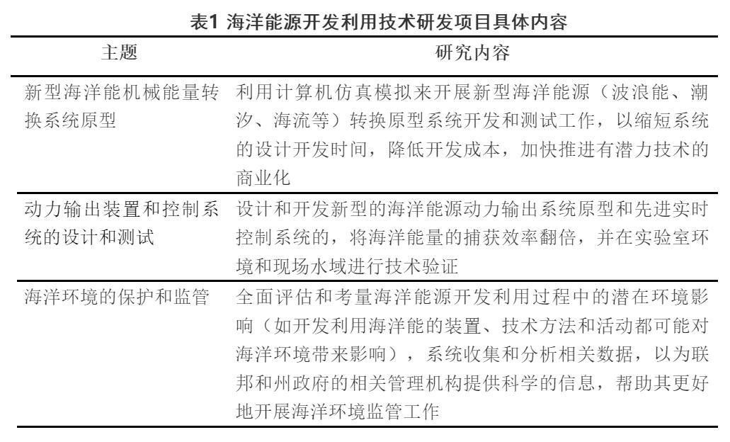 中國儲(chǔ)能網(wǎng)訊:美國能源部(DOE)日前宣布資助2300萬美元支持“海洋能源開發(fā)利用技術(shù)”研發(fā)項(xiàng)目,旨在開發(fā)經(jīng)濟(jì)、高效、環(huán)保的海洋能源(波浪能、潮汐能、海流能等)開發(fā)利用技術(shù),包括先進(jìn)的機(jī)械能量轉(zhuǎn)換系統(tǒng)原型、動(dòng)力輸出裝置、電子電力和控制系統(tǒng)等,并評估和減輕海洋能源開發(fā)的環(huán)境影響,降低海洋能源開發(fā)成本,加速海洋能源技術(shù)的商業(yè)化,維持美國在海洋能源領(lǐng)域的全球領(lǐng)先地位。本次資助項(xiàng)目涵蓋三大技術(shù)主題,包括:(1)新型海洋能機(jī)械能量轉(zhuǎn)換系統(tǒng)原型;(2)新型動(dòng)力輸出裝置和控制系統(tǒng)的設(shè)計(jì)和測試;(3)海洋環(huán)境保護(hù)和監(jiān)管;具體內(nèi)容參見表1。