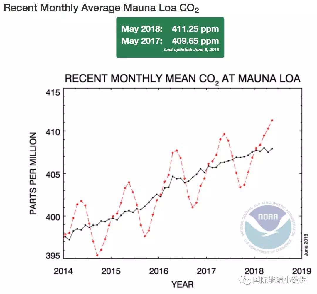 中國(guó)儲(chǔ)能網(wǎng)訊:根據(jù)美國(guó)國(guó)家海洋和大氣管理局(英語(yǔ):National Oceanic and Atmospheric Administration,縮寫(xiě)為NOAA)在夏威夷莫納羅亞(Mauna Loa)天文臺(tái)的觀測(cè),2018年5月份大氣中二氧化碳平均濃度達(dá)到411.25ppm,達(dá)到歷史最高點(diǎn)(去年同期濃度為409.65ppm)。