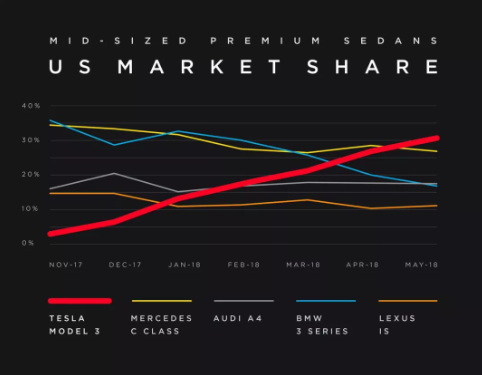首先宣布了一個毫無懸念的消息:隨著產(chǎn)能和交付量的增加,Model 3已經(jīng)成為美國銷量最高的中級豪華車型。其實到4月份時,傳統(tǒng)陣營已經(jīng)僅剩奔馳C級在勉強支撐了,但遇到Model 3這種銷量多寡全由產(chǎn)能決定的選手,傳統(tǒng)陣營被屠榜是意料之中的事。