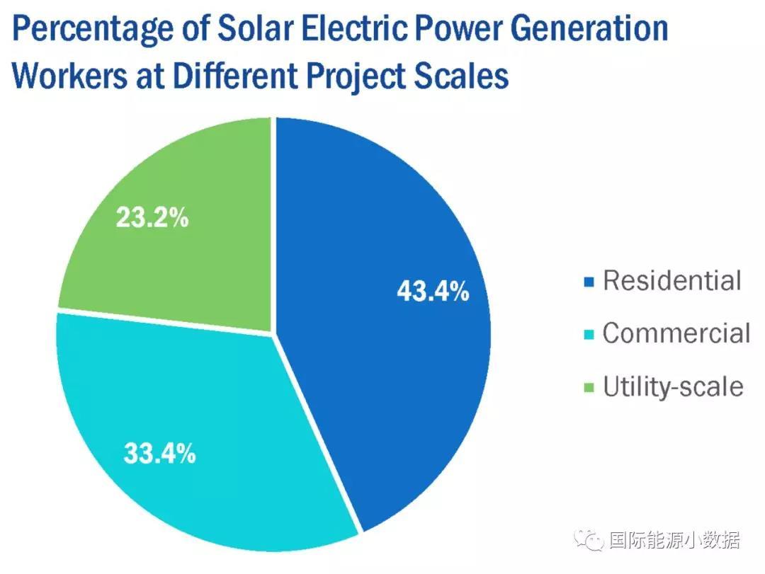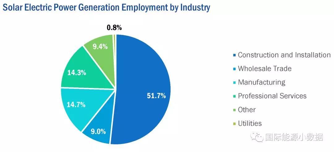 2017年美國公共事業(yè)級光伏發(fā)電量達到496.88億千瓦時,而分布式(商業(yè)建筑、居民屋頂)光伏發(fā)電量為241.39億千瓦時。但是從就業(yè)人數(shù)來看,屋頂光伏占43.4%、商業(yè)建筑光伏占33.4%,而公共事業(yè)級光伏占23.2%。
