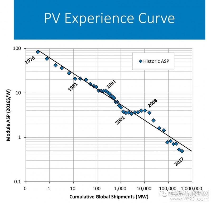 中國(guó)儲(chǔ)能網(wǎng)訊:根據(jù)美國(guó)國(guó)家可再生能源實(shí)驗(yàn)室(NREL)匯總的數(shù)據(jù),編制了1976年至2017年光伏成本的“經(jīng)驗(yàn)曲線(對(duì)數(shù))”,每當(dāng)光伏累計(jì)裝機(jī)加倍,光伏就會(huì)下降大約22%。自2012年以來,光伏組件的實(shí)際價(jià)格已經(jīng)低于經(jīng)驗(yàn)曲線。