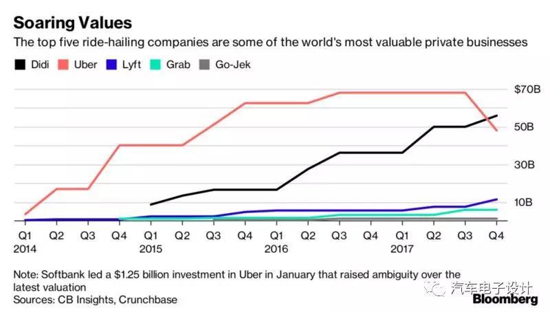 軟銀成為主角,年底之時(shí),它完成三起大宗投資交易:向印度的士打車(chē)公司Ola投資11億美元,購(gòu)入U(xiǎn)ber約15%的股份,12月份滴滴融資40億美元,軟銀參與投資。軟銀在滴滴出行占股20%,在Grab占股30%,如今在Uber也有了15%的股份。打車(chē)公司也都搖身一變,成為世界上估值最高的私營(yíng)公司。截止2018年1月,前5大私營(yíng)打車(chē)公司的總估值已經(jīng)超過(guò)1290億美元,比通用汽車(chē)、福特的總市值還要高。