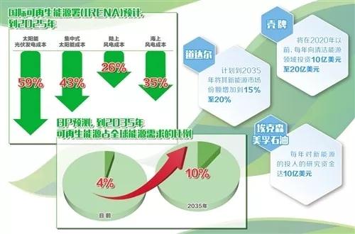 不久前,挪威國家石油公司宣布,未來7年內(nèi)將投資2億美元用于發(fā)展可再生能源,還專門創(chuàng)立了一只規(guī)模可觀的可再生能源領(lǐng)域風(fēng)投基金。意大利石油巨頭埃尼公司也已在全球多個(gè)國家開展太陽能項(xiàng)目,并計(jì)劃2020年之前在可再生能源領(lǐng)域投資5.5億歐元。此外,??松梨谑兔磕陮π履茉赐度氲难芯抠Y金高達(dá)10億美元。