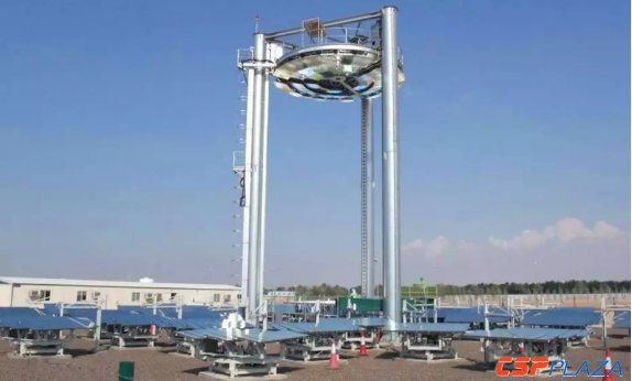 該項目由33套聯(lián)動的定日鏡組成光場系統(tǒng),集熱塔是一種特殊的二次反射塔,塔頂安裝二次反射鏡,將太陽能二次反射至置于地面的熱量接收裝置,與傳統(tǒng)的塔式熱發(fā)電的熱量接收器的位置完全不同。