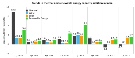 中國儲能網(wǎng)訊:2017年,印度可再生能源裝機(jī)容量12.8吉瓦,新增煤電4吉瓦,這是印度可再生能源增量首次超過煤電。