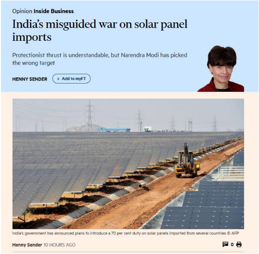 今年1月,莫迪政府卻宣布計劃對從多個國家進口的太陽能電池板征收70%的關(guān)稅,其實主要是針對中國。事實上,除少數(shù)例外,印度幾乎沒有自己的太陽能電池板制造業(yè),而莫迪大肆吹噓的“印度制造”也并未真正出現(xiàn),因此印度采取最新的保護主義政策是可以理解的。