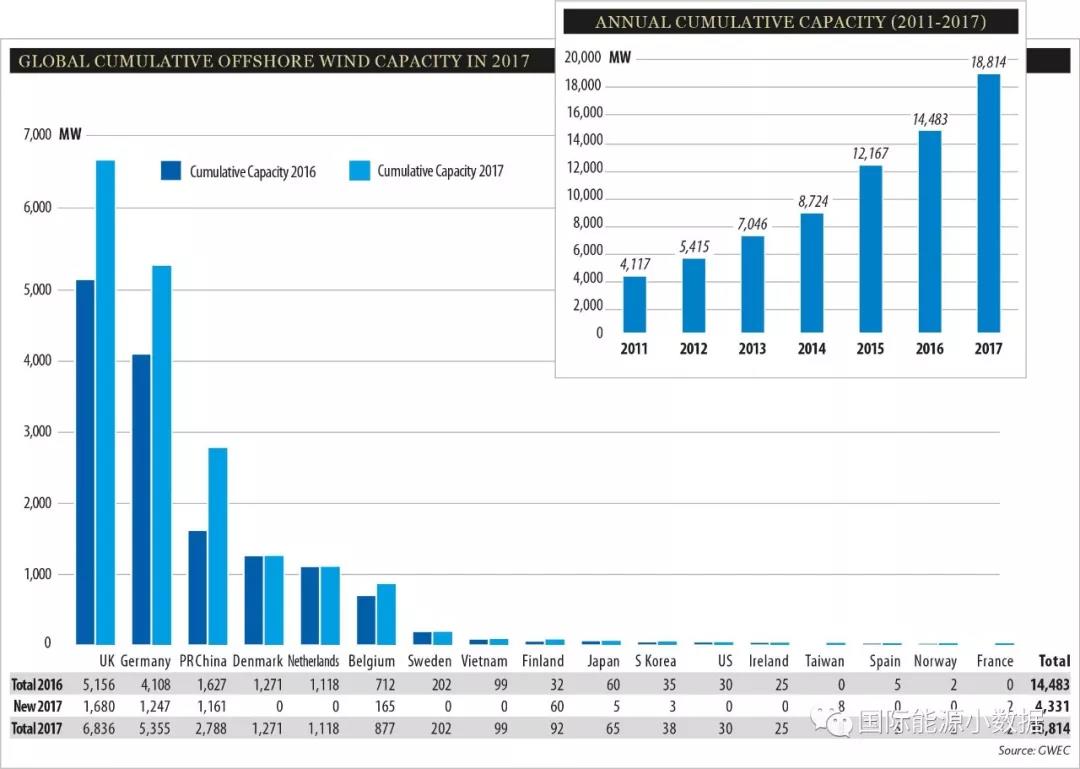 中國(guó)儲(chǔ)能網(wǎng)訊:根據(jù)全球風(fēng)能理事會(huì)的數(shù)據(jù),2017年全球新增海上風(fēng)電裝機(jī)4.331吉瓦,累計(jì)裝機(jī)達(dá)到18.814吉瓦,比2016年總裝機(jī)(14.483吉瓦)增長(zhǎng)30%。其中新增海上風(fēng)電裝機(jī)最多的3個(gè)國(guó)家是:德國(guó)(+1.680吉瓦)、英國(guó)(1.247吉瓦)、中國(guó)(1.161吉瓦)。