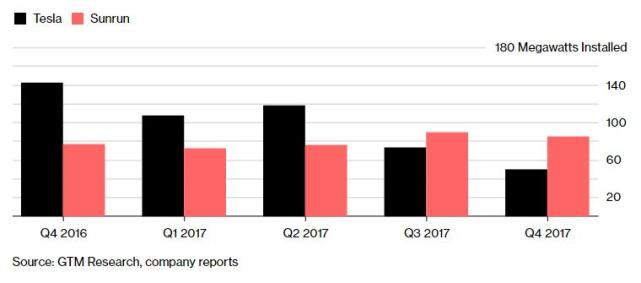 據(jù)研究公司GTMResearch估計,特斯拉在去年第四季度共安裝了87兆瓦的商用和住宅太陽能,其中住宅太陽能為50兆瓦。而據(jù)周二的一份聲明顯示,競爭對手Sunrun公司在同期安裝了85兆瓦的住宅太陽能系統(tǒng)。在去年第三季度,特斯拉的住宅太陽能安裝量也不及Sunrun。