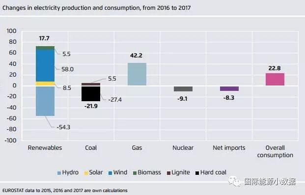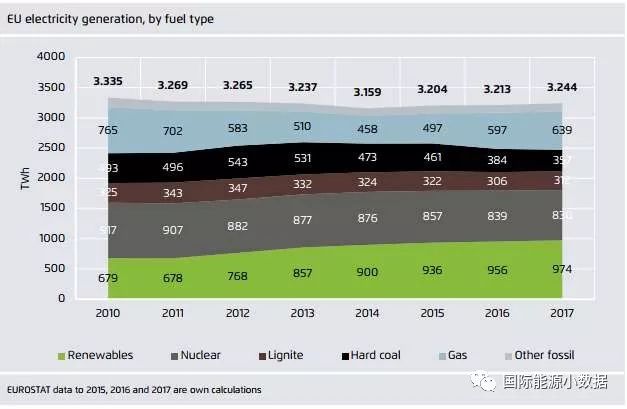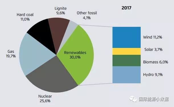 如果在可再生能源中不計(jì)水電,2017年歐盟風(fēng)電、生物質(zhì)和太陽(yáng)能發(fā)電量(679TWh)在歷史上首次超過(guò)了煤電(669TWh)。