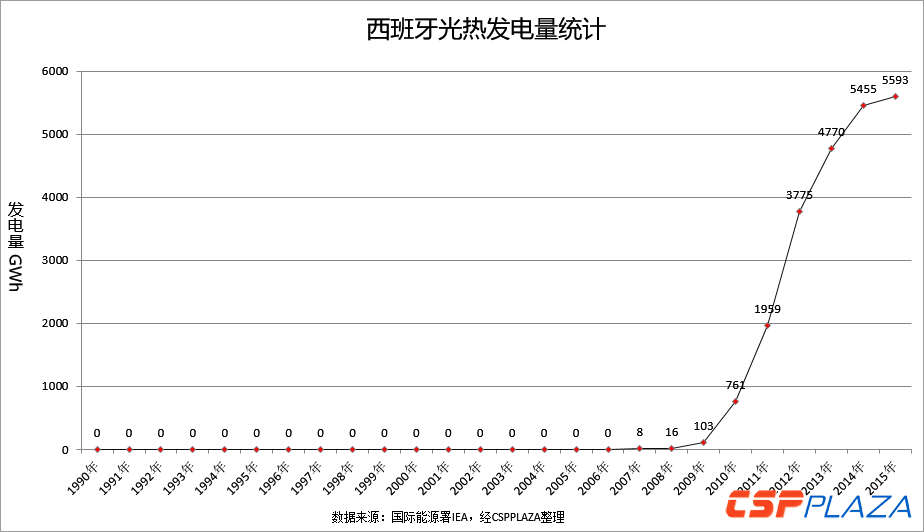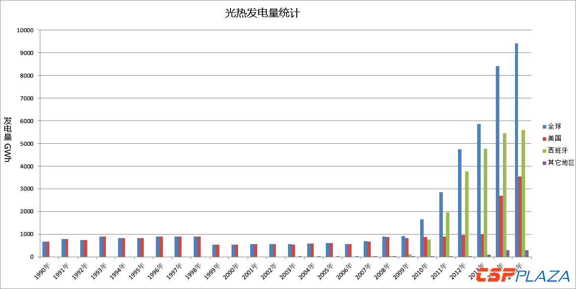 2015年,全球電力總發(fā)電量為24344520GWh,光熱發(fā)電的供電比例約為0.039%。從下面的全球光熱發(fā)電量統(tǒng)計(jì)柱狀圖可直觀反映,光熱發(fā)電的總發(fā)電量大致經(jīng)歷了1990~2008年的平穩(wěn)期、2009~2015年的成長期兩個(gè)階段。