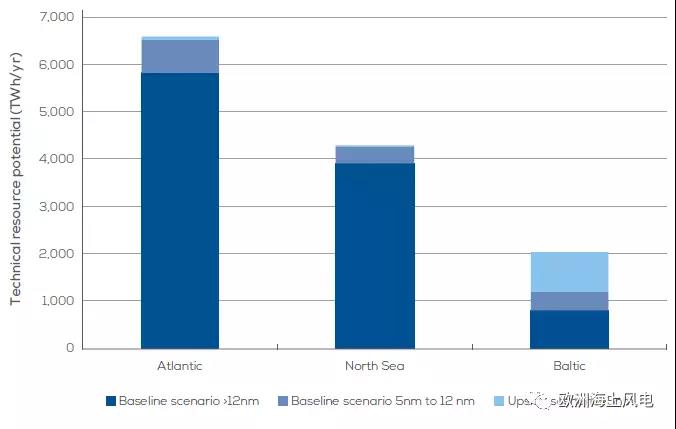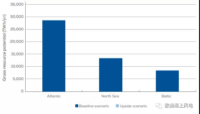 歐洲各國從離岸5海里到專屬經(jīng)濟區(qū)(EEZ)的所有海域,除去已作他用的海域(如航道、漁區(qū)、軍事)和環(huán)境條件不可能作為海上風場的海域所包含的風能資源,按每平方公里5.36MW的密度計算。