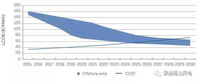 2015~2030年歐洲海上風電和CCGT的LCOE趨勢預測