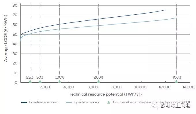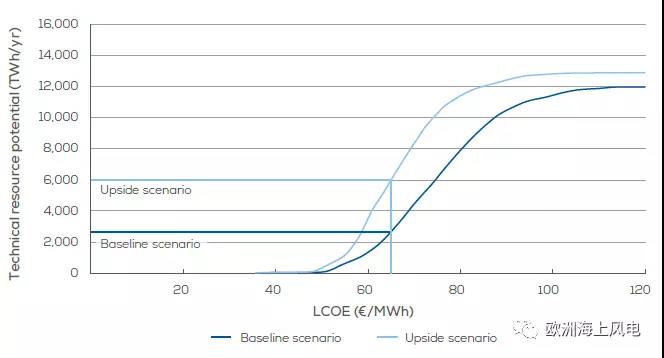 樂觀場景:到2030年,如海上風電要滿足歐洲電量總需求的25%,則其平均LCOE為€51/MWh;50%,€53/MWh;100%(理論計算),€56/MWh。
