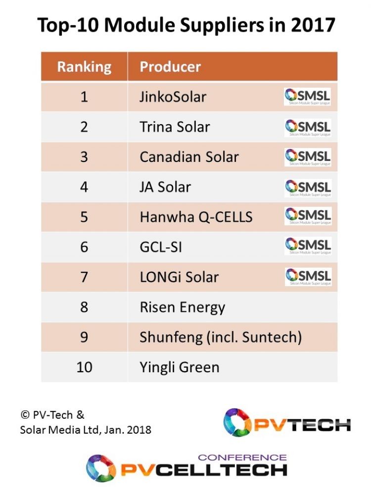 PV-Tech表示,2017年的十大供應(yīng)商總出貨量達(dá)到57吉瓦,其中七家來自硅基組件超級聯(lián)盟SMSL,并占據(jù)榜單的前七位,分別是晶科能源、天合光能、阿特斯太陽能Canadian Solar、晶澳太陽能、韓華集團(tuán)Hanwha Q-CELLS、協(xié)鑫集成、隆基太陽能LONGi Solar。排在第八至第十位的分別是東方日升、順風(fēng)光電、英利綠色能源。