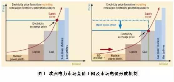 可再生能源參與市場競價后,大幅拉低市場批發(fā)電價。當電力市場中沒有可再生能源時,首先競價成功的是核電、其次是煤電、氣電。如下圖所示:
