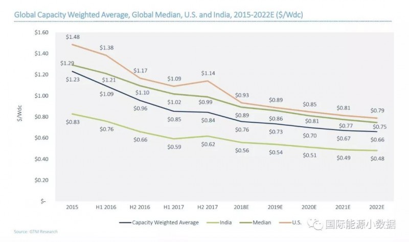 由于供需緊張,2017年下半年美國(guó)大型地面光伏項(xiàng)目的投資成本平均為1.14美元/瓦,比上半年的價(jià)格(1.09美元/瓦)略有上升。同樣,在印度2017年上半年的大型地面光伏項(xiàng)目的價(jià)格為0.62美元/瓦,也超過了上半年的平均價(jià)格(0.59美元/瓦)。但是放眼2022年,光伏系統(tǒng)成本會(huì)繼續(xù)下降:GTM預(yù)計(jì)美國(guó)的光伏系統(tǒng)投資成本為0.79美元/瓦;印度為0.48美元/瓦,全球加權(quán)平均為0.66美元/瓦。