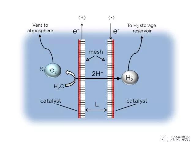 ▲ 不對稱網(wǎng)狀電極示意圖,氧氣和氫氣在不同側(cè)生成,氫氣會上升到特定氣體采集室儲存。(Source:哥倫比亞大學(xué))