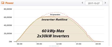 組件背面反射條件越好,PERC雙面雙玻組件發(fā)電量增益越大。白色鋼板的屋頂對于發(fā)電量的提升起到一定積極作用,但由于安裝條件限制,項目的發(fā)電增益并未達到最優(yōu)值。同時,由于發(fā)電量增益遠超出客戶預期,安裝的逆變器選型容量有限,發(fā)電峰值時的數(shù)據(jù)沒有被統(tǒng)計(如圖三所示)。即便如此,該項目發(fā)電增益也已經(jīng)達到了14.9%,若安裝角度采用最佳傾角并加以容量匹配的逆變器,發(fā)電量增益還將大幅提升。