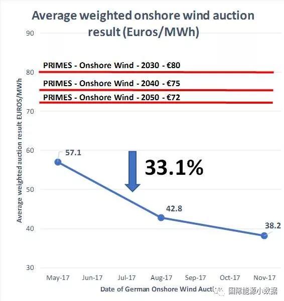 今年5月,德國第一輪陸上風(fēng)電807兆瓦項(xiàng)目招標(biāo)的中標(biāo)企業(yè)平均報(bào)價(jià)為57.1歐元/兆瓦時(shí);而在8月份第2輪的1吉瓦陸上風(fēng)電招標(biāo)中,中標(biāo)企業(yè)的平均報(bào)價(jià)為42.8歐元/千瓦時(shí)。也就是說,德國陸上風(fēng)電在過去6個(gè)月內(nèi)成本下降了33%。