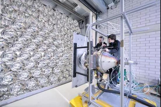 據(jù)德國國家航空航天研究中心(DLR)消息,由149盞短弧氙氣燈組成的Synlight系統(tǒng)已經(jīng)于3月23日正式啟動(dòng)測(cè)試。這堵近14米高、16米寬的“燈墻”,燈光投射到20x20厘米的聚焦平面上,產(chǎn)生的輻射強(qiáng)度是太陽光照射同等面積的1萬倍,溫度最高可達(dá)3000攝氏度,大約是高爐溫度的2到3倍,功率達(dá)350千瓦。