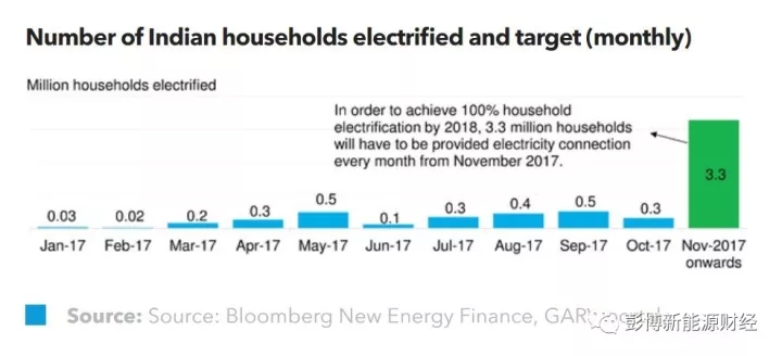 印度政府還計(jì)劃額外撥款25億美元用于農(nóng)村電網(wǎng)建設(shè),并宣布計(jì)劃在2018年12月31日前實(shí)現(xiàn)全國(guó)100%的家庭都能通電。對(duì)比此前的目標(biāo),新計(jì)劃的實(shí)現(xiàn)提前了三個(gè)月,而且電網(wǎng)接通速度需要提高10倍。