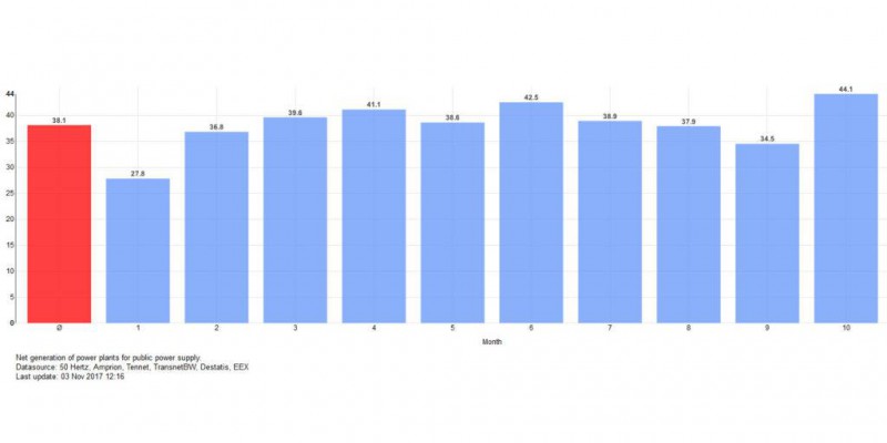 根據(jù)安裝在德國太陽能系統(tǒng)研究所(Fraunhofer ISE)的能源圖表(Energy Charts)數(shù)據(jù),10月份風(fēng)能產(chǎn)量為121.6億千瓦時(shí),而Bruno Burger的分析顯示,當(dāng)月光伏產(chǎn)電量為23.2億千瓦時(shí),分別相當(dāng)于該月德國總發(fā)電量的26.8%和5%。10月份可再生能源電力占據(jù)了電力總需求量的44.1%。