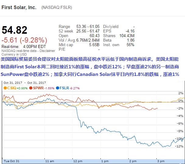 本周二ITC提議公布后,美國(guó)太陽(yáng)能制造商領(lǐng)頭羊股價(jià)明顯走低。