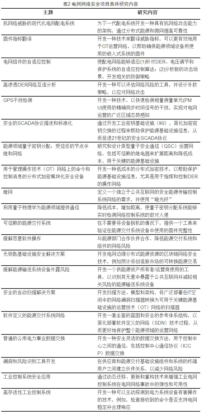通過研發(fā)創(chuàng)新的、可擴展和具有成本效益的網絡安全解決方案來提高美國電網、石油和天然氣基礎設施的可靠性和彈性。電網網絡安全項目涵蓋20個技術主題,具體研究內容見表2。