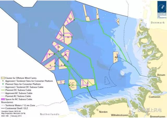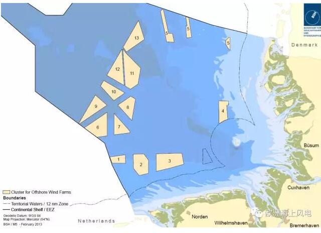 德國聯(lián)邦海事水文局(BSH)負責專屬經(jīng)濟區(qū)內(nèi)經(jīng)濟活動的規(guī)劃。根據(jù)已有的主要航線、次要航線和漁區(qū)的分布,BSH劃出了一些“優(yōu)先開發(fā)區(qū)(Priority Areas)”,作為開發(fā)海上風電的區(qū)域。在2013年發(fā)布的《2030年北海海上風電規(guī)劃》中,共劃定了13處優(yōu)先開發(fā)區(qū),可安裝容量21.3GW(2030年規(guī)劃裝機容量為15GW,詳見【歐洲海上風電】訂閱號10月17日發(fā)布的【市場】德國海上風電政策對中國的啟示——德國海上風電市場系列之二)。