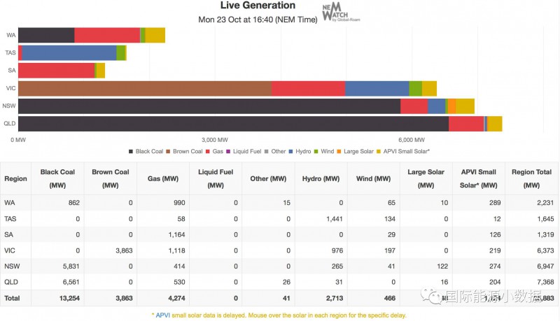 中國儲能網(wǎng)訊:澳大利亞 RenewEconomy網(wǎng)站跟蹤各州的發(fā)電結(jié)構(gòu)(Nem-Watch),并發(fā)布即時數(shù)據(jù)。2017年10月23日星期一東部時間16時40分,即時需求為25,883兆瓦,煤電出力17,117兆瓦,占66.1%;天然氣發(fā)電4,274兆瓦,占16.5%;光伏1,272兆瓦,占4.9%;水電2,713兆瓦,占10.5%;風(fēng)電466兆瓦,占1.8%。