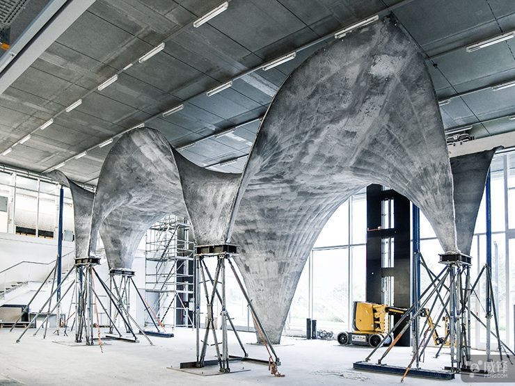 擁有獨(dú)特形狀的屋頂通常采用非可重復(fù)使用的材料建造,比如特制的木材或磨碎的泡沫材料。相反,這個(gè)項(xiàng)目使用的是一種由鋼纜制成的網(wǎng),上面覆蓋著一種聚合物紡織品,形成了混凝土可以粘附的形式。這不僅促進(jìn)了不同尋常的設(shè)計(jì),而且使這個(gè)項(xiàng)目在材料成本方面大大降低。