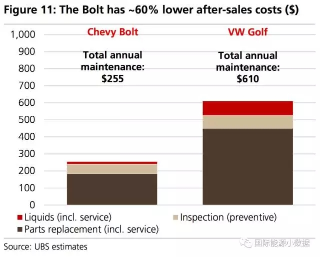 電動(dòng)汽車(chē)少有轉(zhuǎn)動(dòng)部件或需要更換的部件,維護(hù)成本較低,與燃油車(chē)相比維修成本可降低60%(每年可節(jié)省超過(guò)400美元)。這對(duì)于車(chē)行的盈利模式將發(fā)生較大影響,因?yàn)橐话銇?lái)說(shuō)車(chē)行的盈利有60%來(lái)自售后維修和服務(wù)。