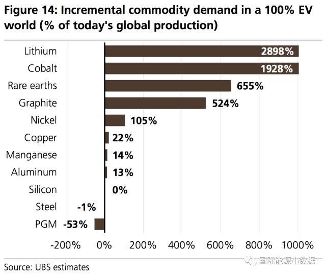 如果電動汽車的市場份額達到100%,那么全球大宗商品的需求變化如下所示: