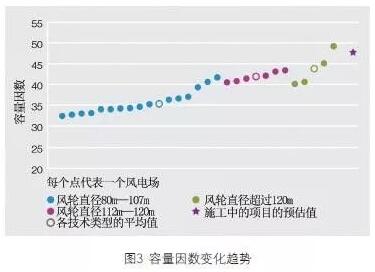 此外, 通過分析英國(guó)海上風(fēng)電項(xiàng)目可以看出,容量因數(shù)(Capacity Factor) 呈現(xiàn)不斷上升的趨勢(shì)。圖3 顯示了在特定風(fēng)輪直徑下,各種技術(shù)類型的容量因數(shù)。圖中并不是按照時(shí)間順序排列項(xiàng)目,而是列出了過去5 年中的平均值,每個(gè)點(diǎn)代表著一個(gè)風(fēng)電場(chǎng)所達(dá)到的容量因數(shù)。從圖中可以看出,當(dāng)風(fēng)電機(jī)組的風(fēng)輪直徑超過120m 后,平均容量因數(shù)接近44%(相當(dāng)于利用小時(shí)數(shù)3854 小時(shí)),而通過在一些目前正處于建設(shè)階段的項(xiàng)目中應(yīng)用新技術(shù),容量因數(shù)將接近48%。這反映出英國(guó)海上風(fēng)電技術(shù)、管理以及資產(chǎn)績(jī)效等方面的提升。
