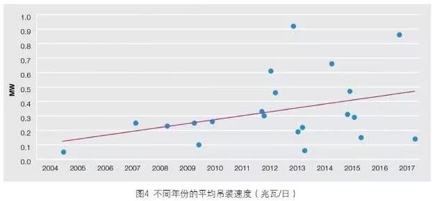 圖4 呈現(xiàn)的是從開工之初到最后一臺(tái)機(jī)組實(shí)現(xiàn)商業(yè)化運(yùn)行期間的吊裝速度(兆瓦/ 日)。整體來看,它呈上升趨勢(shì)。在風(fēng)電場(chǎng)規(guī)模和吊裝速度之間存在明顯的關(guān)聯(lián)性,項(xiàng)目規(guī)模越大,在簽訂合同和雇用安裝船時(shí),就越容易從規(guī)模經(jīng)濟(jì)中受益。