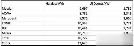 中國(guó)儲(chǔ)能網(wǎng)訊:沙特阿拉伯北部Al Jouf省Sasaka 300兆瓦光伏項(xiàng)目競(jìng)標(biāo)結(jié)果10月3日揭曉:阿布達(dá)比Future Energy Co (Masdar)和法國(guó)EDF Energies Nouvelles聯(lián)合報(bào)價(jià),平準(zhǔn)成本為1.786美分/千瓦時(shí),創(chuàng)光伏報(bào)價(jià)最低紀(jì)錄。沙特阿拉伯Acwa Power公司報(bào)出2.341美分/千瓦時(shí),排在第2位;其他公司報(bào)價(jià)見(jiàn)下表。