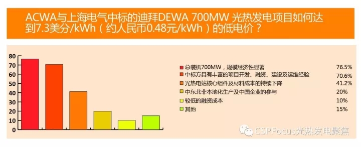 針對本次迪拜700MW光熱電站如何投出如此低的電價水平,CSP Focus對剛剛參與了CSP Focus光熱發(fā)電中東北非聚焦大會的代表進行了調(diào)研。綜合來看,如此低的中標價格得益于該項目的規(guī)模效應、較低的融資成本、中標方豐富的經(jīng)驗、電站成本的持續(xù)下降、生產(chǎn)本地化、中國元素的注入等因素。(詳見下圖,點擊放大)